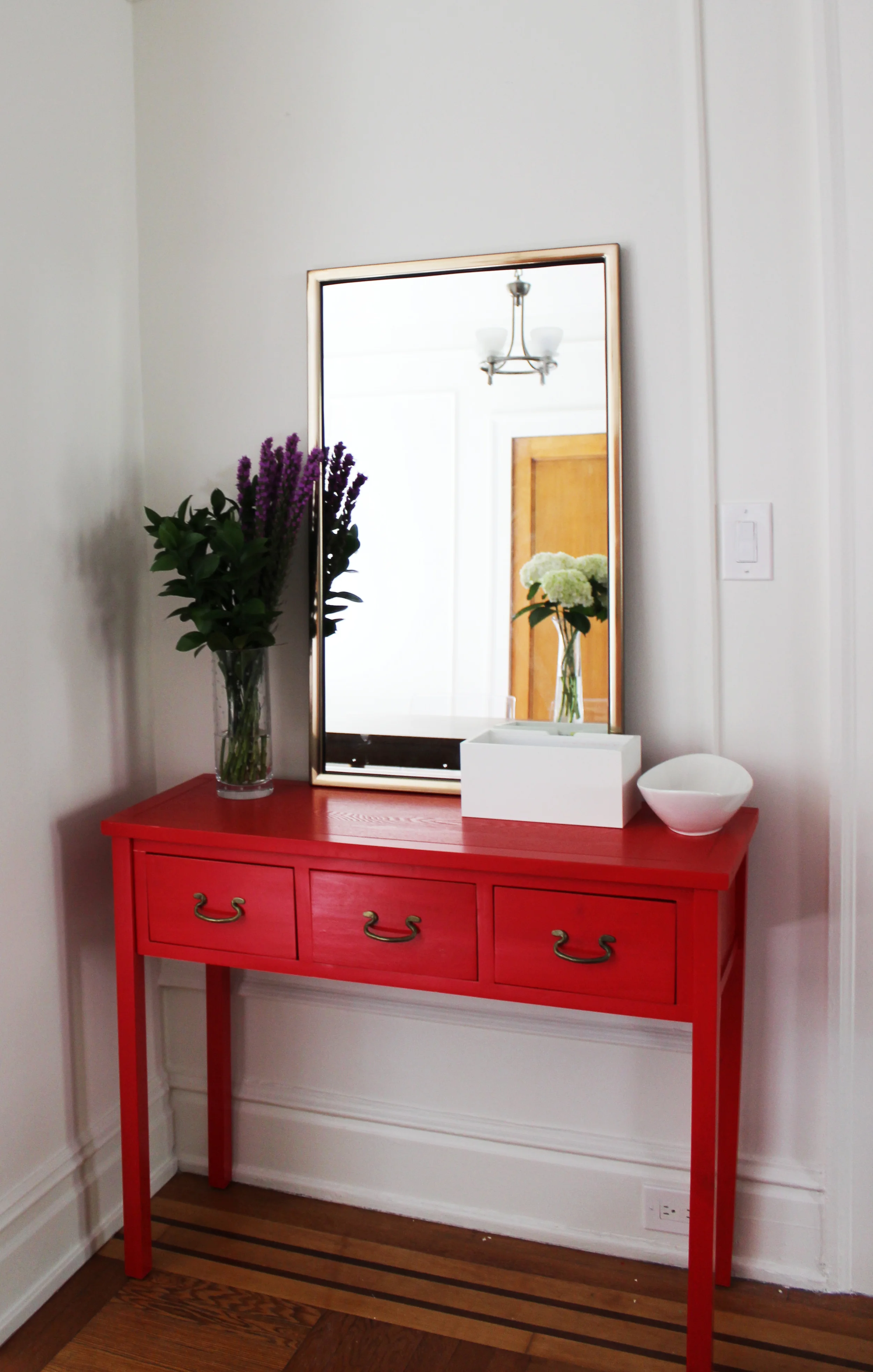 And last but not least, the entryway. For any household, I always advocate for a landing zone, a place to tuck your shoes in if you live in a shoeless house, a place to drop off your mail and keys, etc. Why not keep it fun with cherry red? That's exactly what we did.